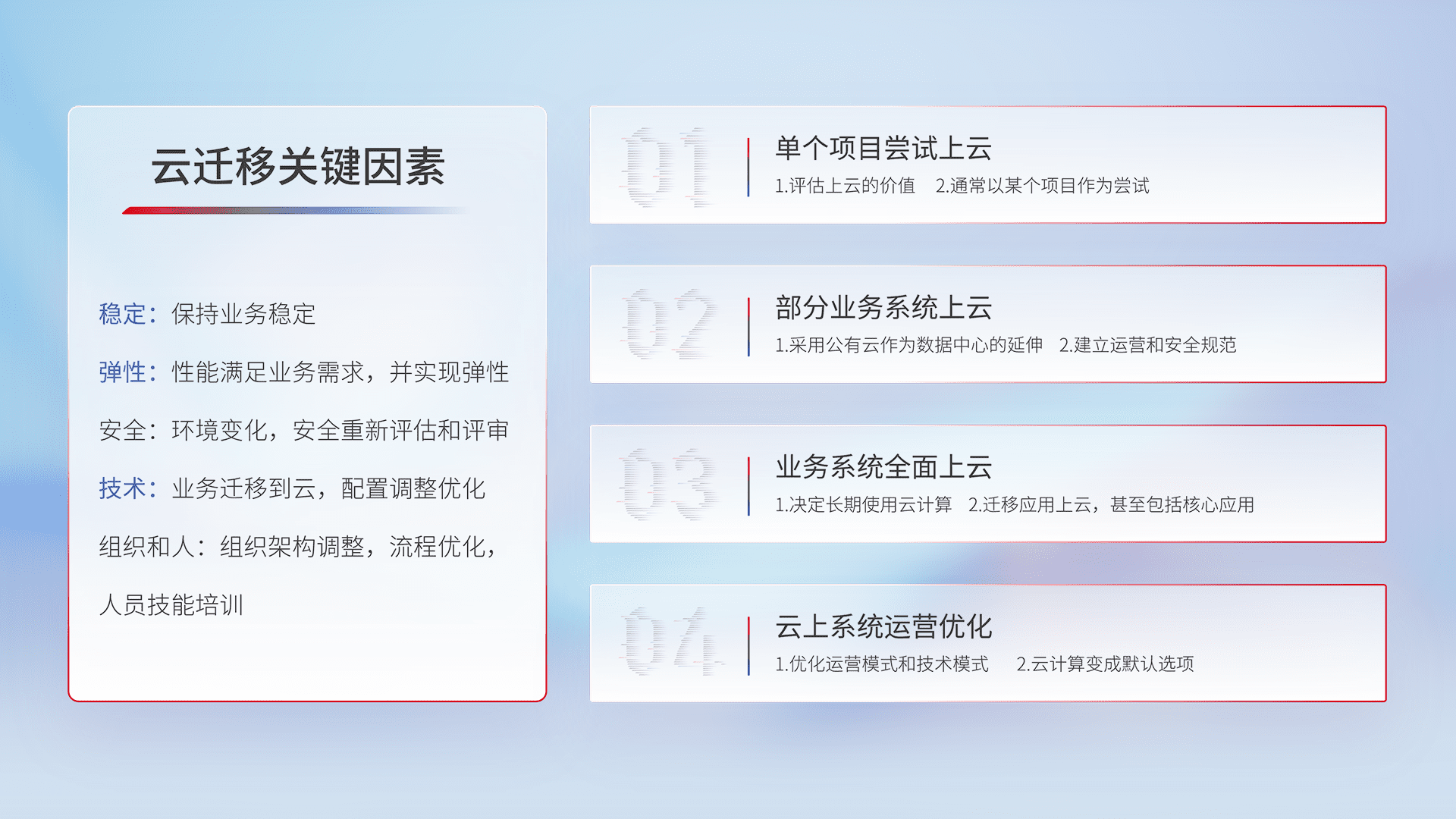 结合实际业务,,,,从规划设计、、云平台选型、、云原生改造、、、数据迁移、、、、集成交付,,,,迁移全过程为客户识别最佳上云路径,,,做好风险识别管理,,设计网络架构、、身份权限、、、安全审计合规、、操作审计、、日志审计、、监控告警策略、、、多站点容灾设计等,,,,对云上基础设施进行整体规划,,提升IT治理水平,,,以满足弹性、、高可用、、高性能的需求。。。